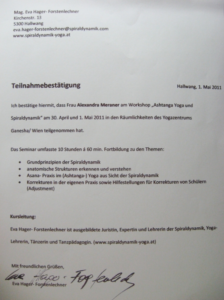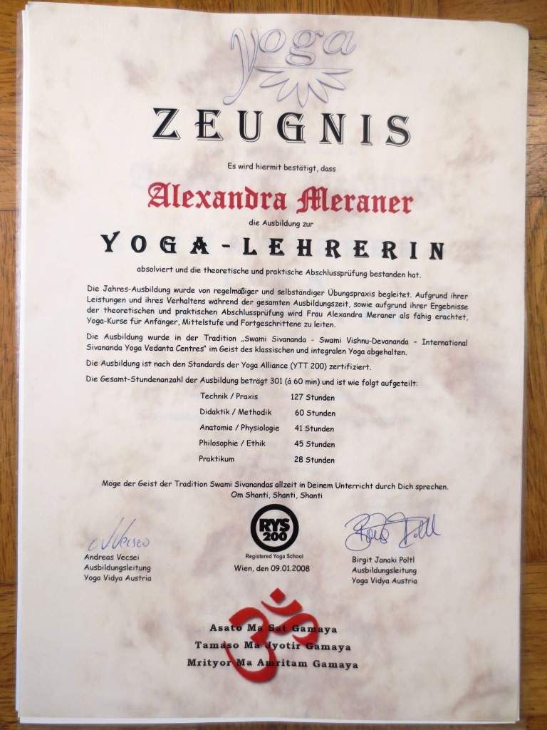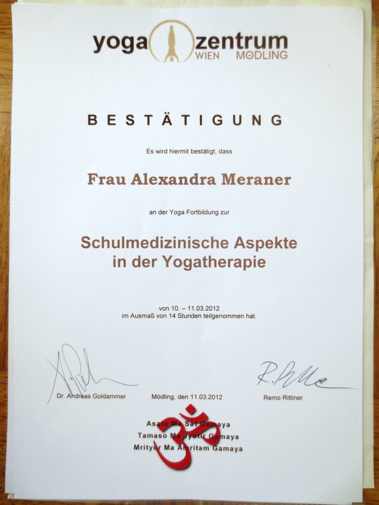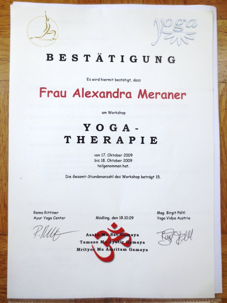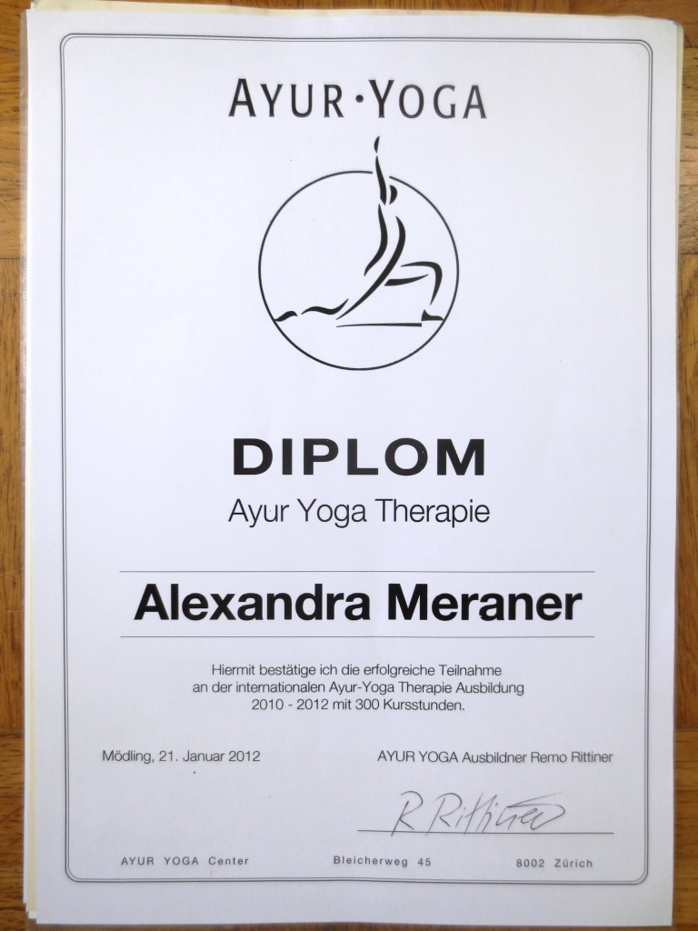 – Abschluss der 2-jährigen Ausbildung zur Ayur-Yoga Therapeutin