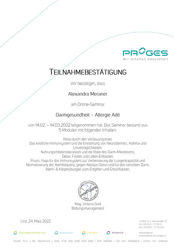 - Weiterbildung „Yoga für die Darmgesundheit“ bei Proges – wir schaffen Gesundheit