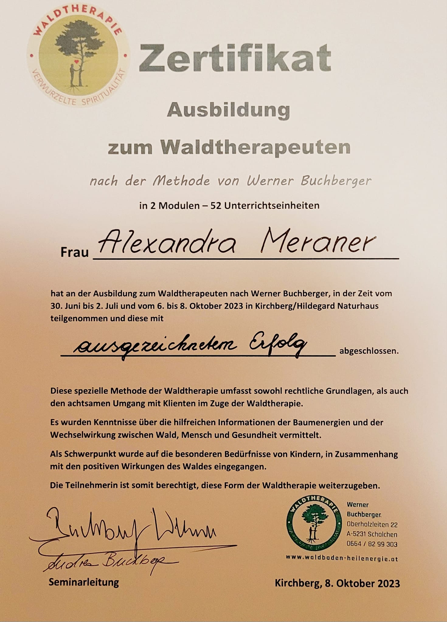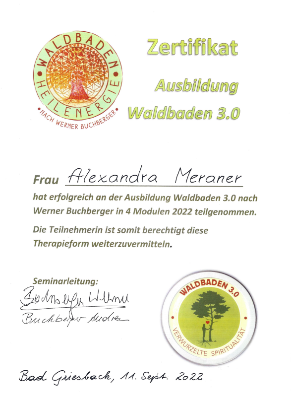 - Abschluss Ausbildung Waldtherapie bei Andrea und Werner Buchberger in Bad Griesbach